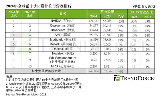 根據(jù)TrendForce集邦咨詢(xún)公布的數(shù)據(jù),2024年全球前十大IC設(shè)計(jì)業(yè)者營(yíng)收合計(jì)約 2498億美元,年增49%。